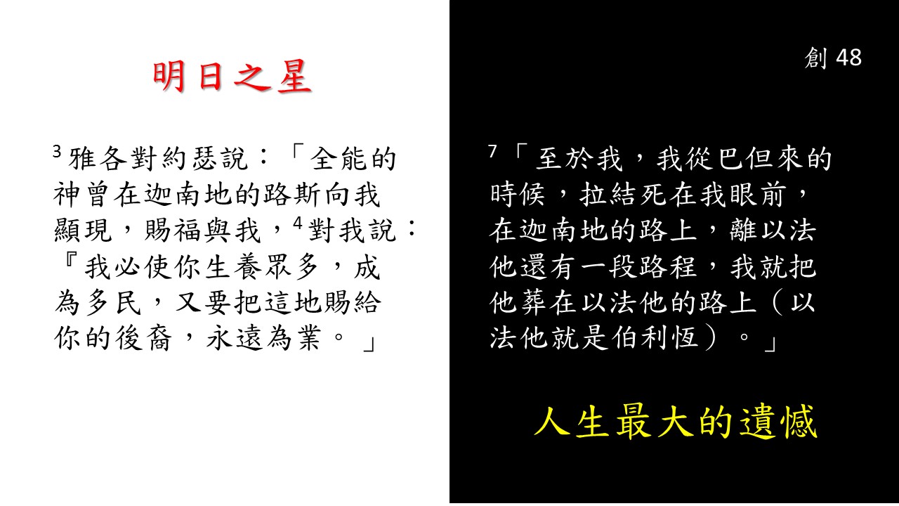 他對約瑟說:「全能的神曾在迦南地的路斯向我顯現,賜福與我,對我說:『我必使你生養眾多,成為多民,又要把這地賜給你的後裔,永遠為業。』 」(創 48:3-4)雅各自述,他出生就是明日之星,在他離家的時候,神親自向他顯現,將應許亞伯拉罕的,傳承給他,把子孫、應許地賜給他,但他繼續說:「至於我,我從巴但來的時候,拉結死在我眼前,在迦南地的路上,離以法他還有一段路程,我就把他葬在以法他的路上(以法他就是伯利恆)。」(創 48:7)他心愛的拉結,在他回家的路上,死在伯利恆的路上,這是他人生最大的遺憾。