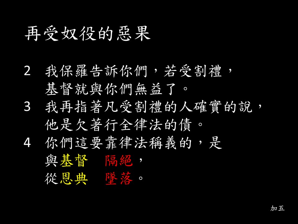 1)基督對你們就毫無益處。動詞是未來語態,指的是他們若接受割禮的時候。接受割禮的含意,就是認為神在基督裡所成就的並不足夠,在信耶穌之外,還必需接受割禮,基督之死並無足夠救贖的能力,這樣基督就是徒然死了(二 21),那還有什麽益處可給予信徒呢?